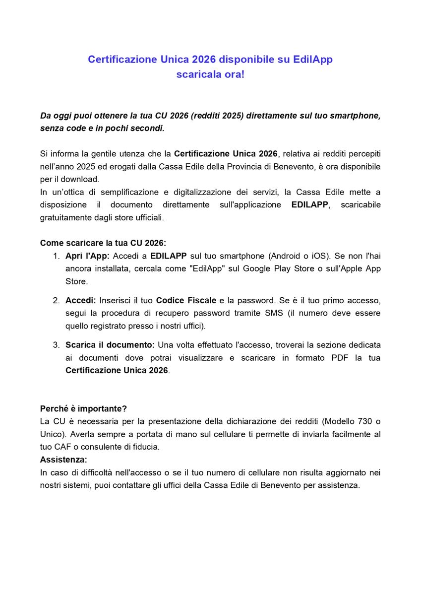Si informa la gentile utenza che la Certificazione Unica 2026, relativa ai redditi percepiti nell’anno 2025 ed erogati dalla Cassa Edile della Provincia di Benevento, è ora disponibile per il download.